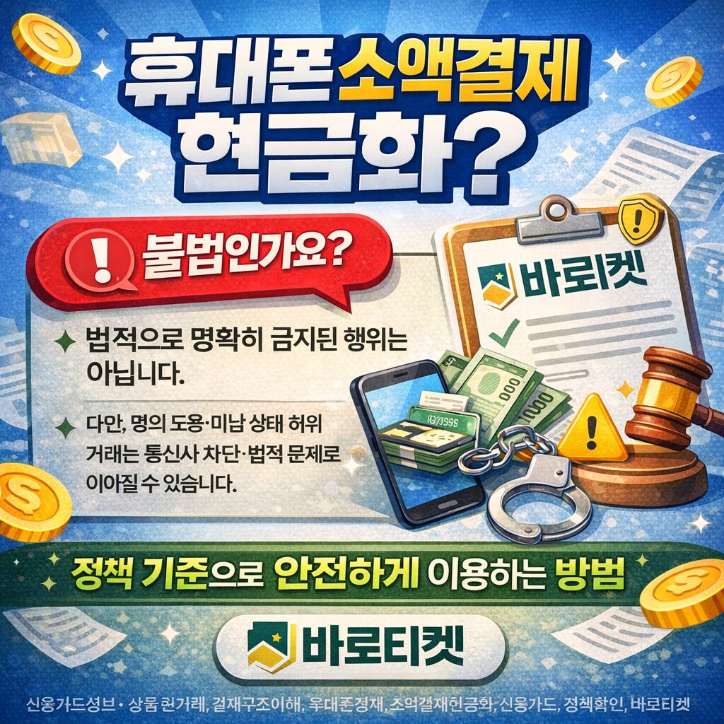 아닙니다. 본인의 한도를 이용해 상품권을 구매하고, 이를 개인의 의사로 매매하는 행위 자체는 불법이 아닙니다. 단, 타인 명의 도용이나 '카드깡'과 같은 불법 대출 형식을 취하는 업체는 피하셔야 합니다. 바로티켓은 정식 사업자 등록 업체입니다.