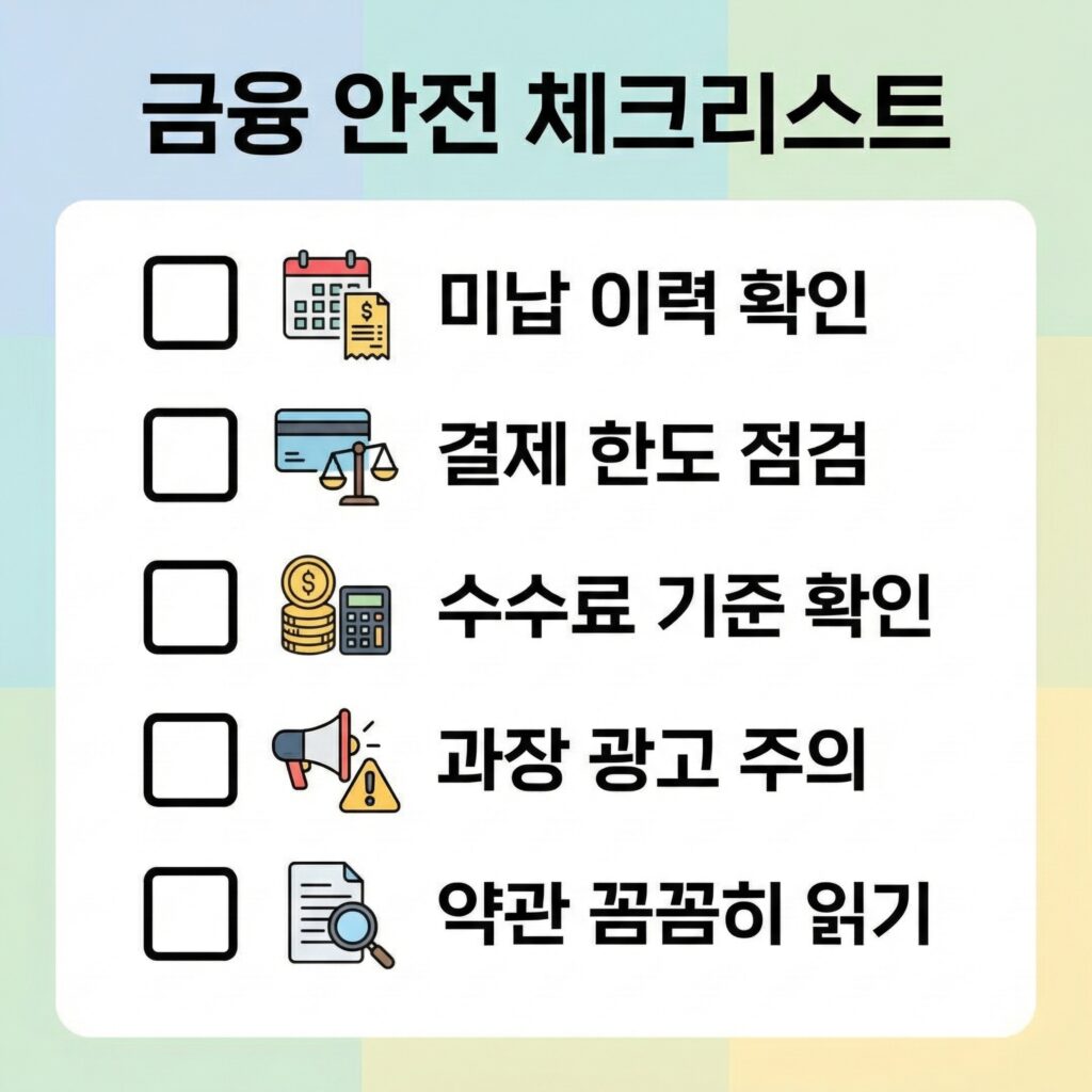 A. 정책 고지, 결재 한도, 미납 여부, 수수료·정산 기준, 제한 조건의 투명성 등을 함께 확인하는 것이 좋습니다.